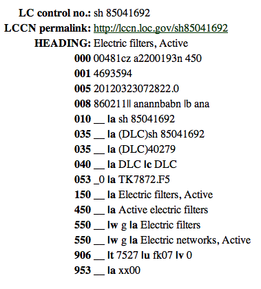 In LC’s Online Catalog (side note: their updated site was having too many problems so they revert back to the previous one and I’ve not had the issues that the new one experienced; it’s an awesome new design if they can get the bugs out!), the item only lists “Electric filters, Active $x Design and construction” for the one sub. head. And merely 7 other records have this same heading, though there are many more variants and lots with just the base heading.