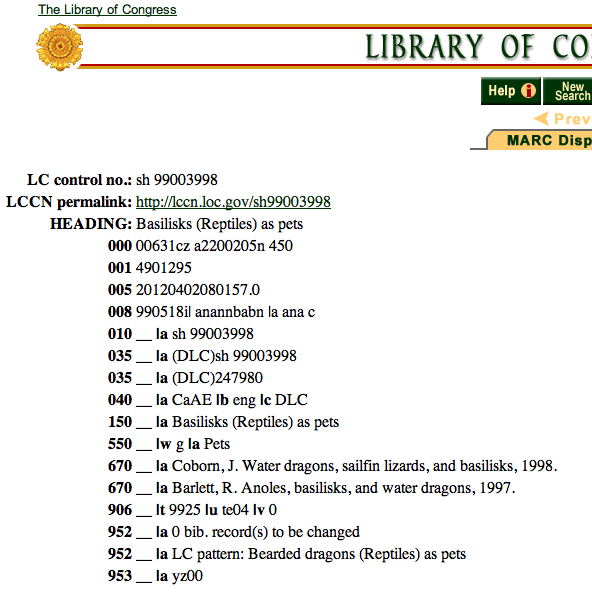 My favorite is Basilisks (Reptiles) as pets since all that I could think of was Harry Potter and the basilisk in the Chamber of Secrets. Seriously, typing in basilisk into Wikipedia brings up the mythological creature by default, and offers up a tiny disambiguation link at the very top of the entry. This showcases another inconsistency within LC subject headings: common names and scientific names are randomly used when setting up a heading rather than preferring one over the other and making a reference to the other in the heading.