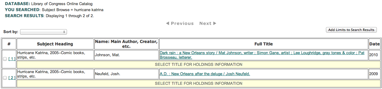 The single most interesting, for me, was Hurricane Katrina, 2005–Comic books, strips, etc. This is cataloging lingo for graphic novels, lately anyway.