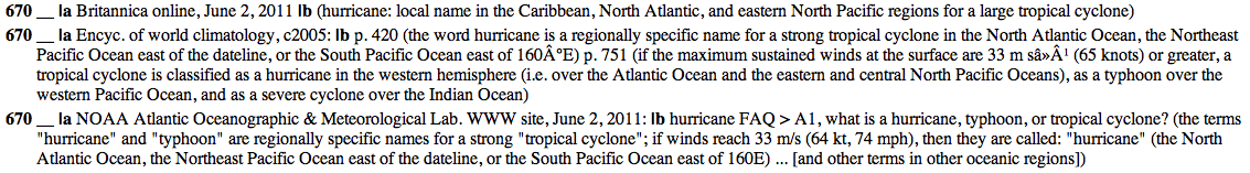 And the list goes on! This is only part was through the Ds, so check out the LC Authorities File Online to see the rest. Besides getting a scope of how many hurricanes are written about individually, the notes in the “hurricanes” authority record are priceless and fascinating–take a look below.