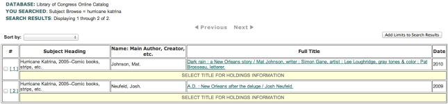 The single most interesting, for me, was Hurricane Katrina, 2005–Comic books, strips, etc. This is cataloging lingo for graphic novels, lately anyway.