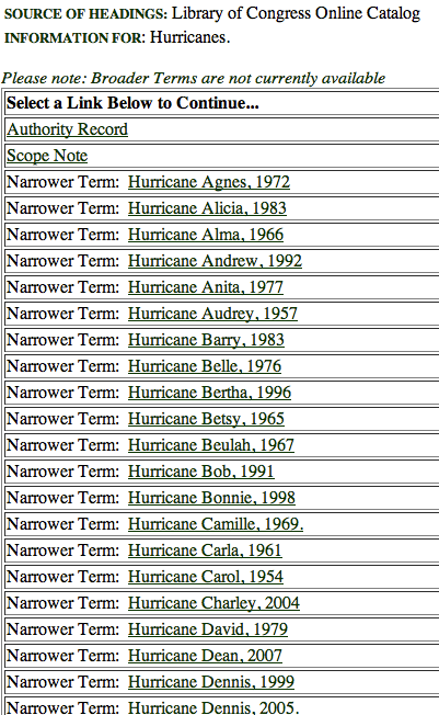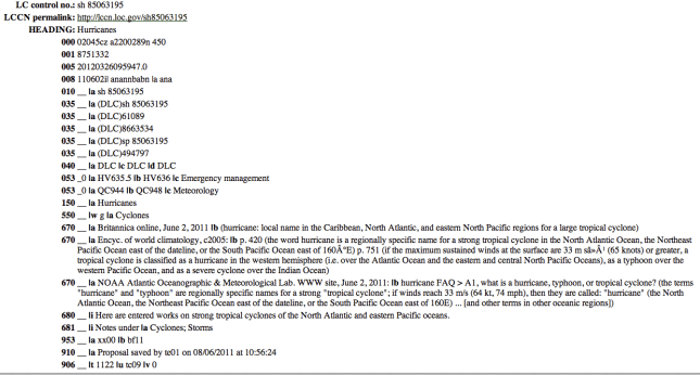 And the list goes on! This is only part was through the Ds, so check out the LC Authorities File Online to see the rest. Besides getting a scope of how many hurricanes are written about individually, the notes in the “hurricanes” authority record are priceless and fascinating–take a look below.